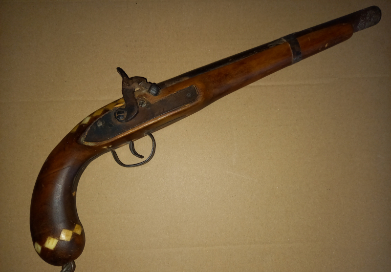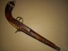 Verkaufe Dekorationswaffe Vorderlader-Perkussionspistole aus Indien / Pakistan. Das Perkussionsschloß ist funktionsfähig, der glatte Lauf ist nach hinten offen und damit absolut nicht schußfähig. Länge ca. 45 cm. Ein dekoratives Stück für die Wand. Verkauf nur gegen Altersnachweis.