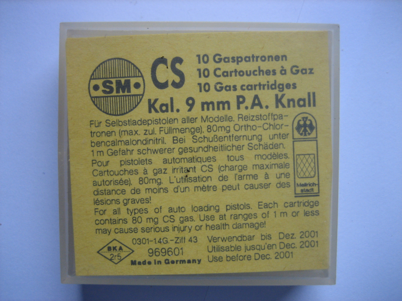 Aus Sammlungsauflösung wird angeboten -- Eine Schachtel mit 10 Stk. Gaspatronen - mit Kunststoff Faltverschluß - für Pistolen - besonders starke Ladung - Hersteller SM - 9 mm für Pistole - Ladung: 80 mg. Chlorbenca... - Patronen wurden kühl und trocken gelagert - Haltbar bis 12/2001 -- Patronen können Oxidationsspuren aufweisen +++ Der Versand erfolgt mit DHL (unversichert). Die Versandkosten gelten nur für Deutschland. -- Kein Internationaler Versand -- Privatverkauf, daher keine Gewährleistung, Garantie oder Rücknahme. Bei Fragen einfach mailen.