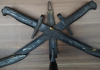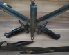 Sie bieten auf eine Konstruktion aus sieben Seitengewehren M1870/87/15 für das italienische Vetterli-Vitali (Vetterligewehr), in der 1915-Ersten-Weltkriegs-Version mit original gekürzter Klinge, beidseitiger Hohlbahn sowie entferntem Parierhaken, so wie sie von den Italienern im Ersten Weltkrieg geführt wurden. Die Bajonette wurden scheinbar zu einer Wandgarderobe zusammengefügt, dazu wurde bei zwei der Seitengewehre die Klinge halbiert, bei einem dritten Bajonett wurde die Klinge umgebogen. Die Drückergarnituren sind bei allen Bajonetten vollständig und funktionieren, soweit erkennbar sind es TERNI-Fertigungen. Die Blankwaffen wurden augenscheinlich mit Messinglot aneinander hartverlötet. Ob das in einer Schirrmeisterei oder bei einem Dorfschmied passiert ist, wird sich nicht mehr klären lassen. Möglicherweise waren die Bajonette Beutestücke deutscher Truppen im Gebirgskrieg gegen die Italiener und wurden im Ersten Weltkrieg als eine Art Grabenkunst zusammengefügt. Die Bajonett-Installation wurde von mir in den 1990ziger Jahren im Allgäu erworben und soll aus einer Gebirgsjägerkaserne stammen, welche 1945 von den Franzosen geplündert wurde, danach verstaubten sie auf einem Dachboden bei einem Bauern. Ungereinigter Zustand, mit Verschmutzungen/Alterungsspuren, der Vorbesitzer hat damals an mehreren Stellen unsachgemäß mit Schleifpapier versucht Schriftzüge besser lesbar zu machen. Die Photos sind Teil der Artikelbeschreibung. Die Versandkosten von 7,69 Euro (Paket, DHL) trägt der Erwerber. Kein Internationaler Versand, versendet wird nur innerhalb Deutschlands. Keine Rückgabe, kein Umtausch, keine Nachverhandlungen. Der Verkauf erfolgt als Privatperson, unter Ausschluß der Garantie und der Gewährleistungsrechte. Bieten Sie bitte nur, wenn Sie damit einverstanden sind. Stellen Sie Fragen bitte vor Gebotsabgabe, wenn sie sich unsicher sind, ob sie den Artikel wirklich erwerben wollen, bieten Sie bitte nicht mit, bei Spaßbietern verstehe ich keinen Spaß.