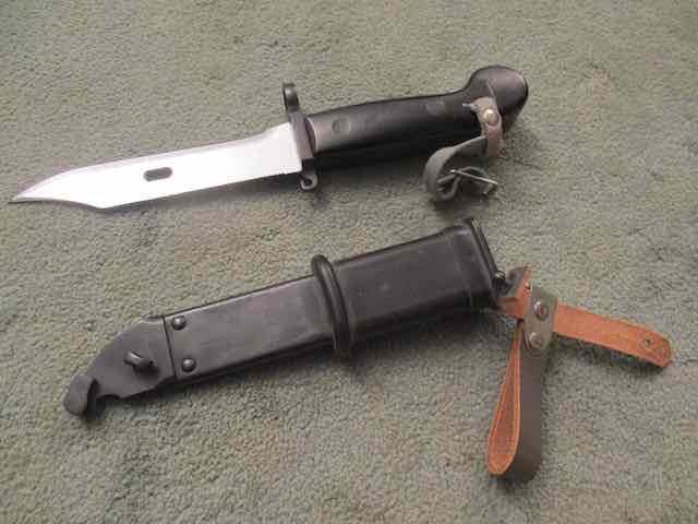 Im Kundenauftrag, Mehrzweck-Bajonett, DDR, für AK 79/2. Gummierter / Kautschuk Koppelschuh, wohl ist Griff, zum Draht schneiden etc. Griff ist aus Bakelit, braun. Beriemung Leder. Weitere Fotos auf Anfage. Internationaler Versand auf Anfrage.