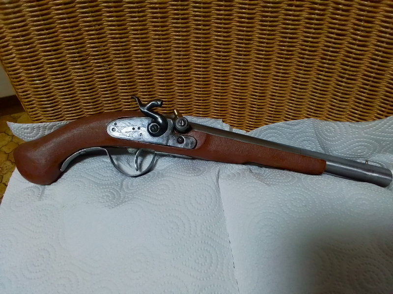 Hier mal wieder ein Stück aus der gesammelten Werke Kiste meines verstorbenen Vaters.Auf der linken Seite vom Lauf sind Zeichen und die Kaliberangabe eingeschlagen.Wenn mein Vater damit auf dem Kellerschiessstand geschossen hat dann durfte ich meistens auch mal unter Aufsicht schiessen.Er hat immer sehr genau darauf geachtet das nur 4,4mm Bleirundkugeln verwendet wurden. Als Treibladung wurde die grossen Zündhütchen mit 4 oder6 Flügeln benutzt aber nur diese und kein Pulver. Der Schaft hat keine Risse oder sonstige Beschädigungen nur halt normale Gebrauchsspuren. Was für Holz das ist kann ich nicht sagen.Der Hahn rastet nur einmal ein so das man schiessen kann.Der Hahn sitzt stramm und der Abzug geht etwas schwer. Da bin ich wohl von meinen Waffen vom Sportschiessen verwöhnt. Noch sind diese Vorderlader Waffen frei ab 18 Jahren, daher an den Altersnachweis denken, falls kein ID Mitglied. Lauf und Piston sind durchgängig und Trockenfunktion ist gegeben.