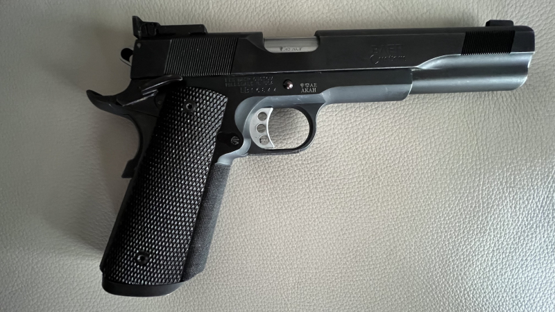 Verkaufe 1911'er Pistole von Les Baer im Kaliber .45 ACP. Es handelt sich um das Sondermodell Ultimate Master in 6 Zoll Ausführung und einer Präzisionsgarantie von 1,5 Zoll auf 50 Yard, siehe auch Original Schussbild.