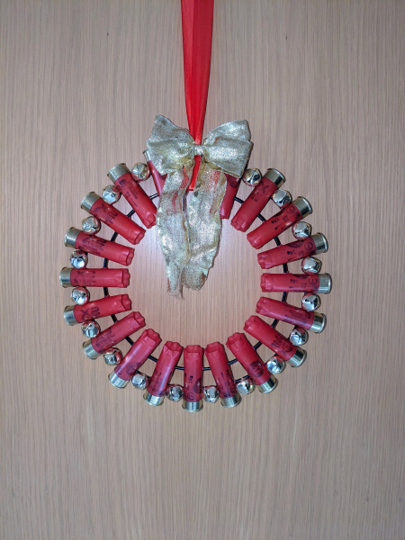 Zum Verkauf steht ein von Hand gefertigter Weihnachtskranz aus roten 12/70-Schrothülsen (leer/unschädlich) und kleinen Glöckchen. Ein echter Hingucker für Revier, Jagdhütte, Schützenhaus oder Hobbyraum – ideal als Geschenk oder Deko für die Weihnachtszeit.
