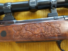 Handschutz links und rechts mit handgeschnitzter Gravur (Keiler bzw. Rehbock). Schaft ebenfalls handgeschnitzt mit