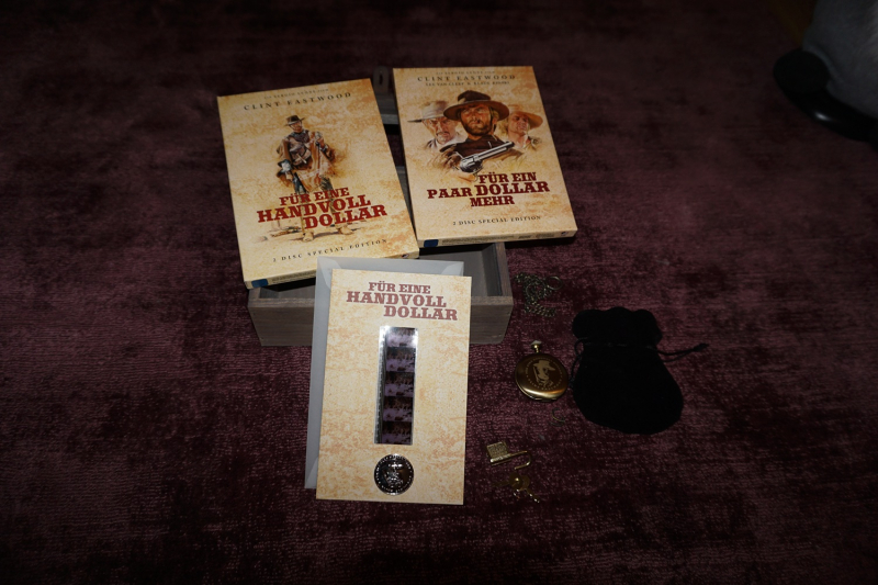 sie bieten hier auf einer Sammler Edition in eine Holz Box / Kiste von den Westernfilmen für eine Handvoll Dollar 1 und 2. Aus dem Jahr ca. 2005 Die Box Stand bei mir nur im Schrank und ist in einem Schönen zustand. Die Filme wurden nie ausgepackt und der Original Filmstreifen mit Münze ist auch in einen guten Zustand. Nur bei der Uhr gibt es etwas. Der Ring für die Uhrenkette ist zerbrochen und da es sich um eine Batterie in der Uhr handelt muss ich dazu sagen das ich nicht weiß ob sie ausgelaufen ist oder nicht da sie ja seit gut 20 Jahren in der Uhr ist Deswegen würde ich die Uhr als Defekt angeben. Aber ansonsten ist es ein schönes Sammlerset Alles weiteres sehen sie auf den Bildern.