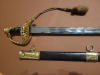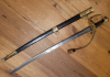 Top erhaltener Offiziersdegen der Französischen Marine aus der Zwischenkriegszeit. Hersteller Coulouise, Clingenthal mit 2 tiefen Abnahmestempeln auf der Klinge oberhalb der Parierstange. Bestmögl. unbefummelte Erhaltung, keine Flecken auf Klinge, keine Kratzer auf der Lederscheide, nur 1 kleine Dalle im mittl. Scheidenbeschlag. Portopee mit seitl. Fellbommel soll Schiffsarzt bedeuten. Kann auch mit anderen freien Waffen, Uniformen Napoleonik bis WK I im Bad Harzburger www.napoleon-museum.de abgeholt werden. GL 98cm, KL 71 cm.