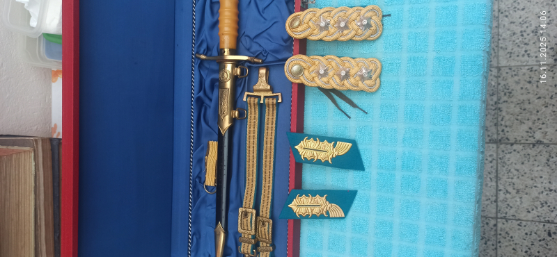 NVA Luftwaffe Generalsdolch,mit Verleihungsbox und Effekten , original, eine Seite der Scheide etwas rostnarbig, Rückseite der Box leicht beschädigt,siehe Fotos.