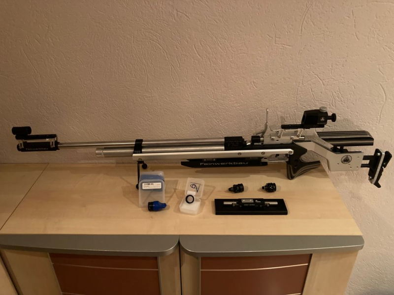 Geliefert wird das Gewehr mit dem original FWB 12er Klick Diopter, 22mm Korntunnel , versellbarer Handstütze , diversem Bordwerkzeug und und dem Fülladapter in der FWB Zubehörbox im abschließbarem (Zahlenschloss) FWB Kunststoffkoffer.