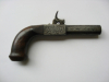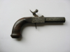 Dies ist eine Taschenpistole mit Perkussionsverschluss. Diese Pistolen waren in der zweiten Hälfte des 19. Jahrhunderts sehr beliebt und wurden gegen streunende Hunde, Wegelagerer usw. eingesetzt. Sie waren in vielen Ausführungen erhältlich, von sehr einfacher bis hin zu außergewöhnlich hochwertiger Verarbeitung. Ihr Exemplar ist gewiss nicht von minderer Qualität: Der Abzug lässt sich sauber im Mechanismus versenken, sodass er weder beim Tragen in der Manteltasche noch beim Ziehen der Waffe im Notfall stört. Auch der Schaft ist nicht einfach nur ein Stück Holz; er ist im eleganten Stil des französischen Empire gefertigt.