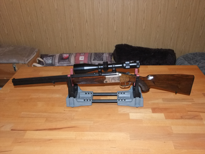Die Merkel (Simson) BBF Luxus ist eine praxisgerechte Jagdwaffe mit Handspannung. Der Schaft mit Pistolengriff, bayerischer Backe und Schweinsrücken. Das montierte Zielfernrohr von Docter 2,5-10x48 mit LP ist auf einer Schwenkmontage montiert. Die Abzüge sind fein einstellbar und die Kaliber Kombination ist 7x65R / 20/76. Auf den Seitenplatten sind Fuchs und Ente sowie Rehwild graviert. Das Pistolenkäppchen ist mit einem Waschbären graviert.