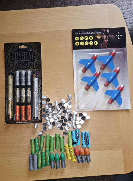 Zum Angebot kommt hier ein Silvesterset mit über 100 Teilen. Dabei sind Leuchtpatronen, Pfeif-und Ratterpatronen,Moonrider, Zink Feuerwerk und Leuchtraketen. Dazu gibt es noch 50 Knallpatronen nach Wahl. Entweder 50 PAK ODER 50 RK Patronen( siehe Fotos). Es wurde alles trocken gelagert und sollte somit auch funktionieren.