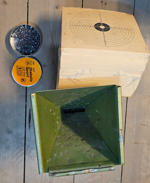 Hier habe ich Zubehör für Druckluftschießen. Dabei ist ein benutzter Kugelfang, ca. 100 Diabols kal. 4,5 mm und ein 100er Paket Zielscheiben Rest siehe Foto