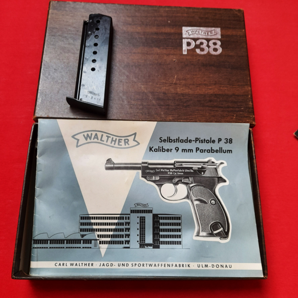 Zum Vekauf steht eine Pistolenschachtel (Karton) inklusive Magazin (Magazin erfaßt 8 Patronen) und Beschreibung für eine Selbstlade-Pistole P38 von Walther, Kaliber 9mm Parabellum. Es handelt sich um einen Privatverkauf, daher erfolgt der Verkauf unter Ausschluß jeglicher Sachmängelleistung. Versand erfolgt nach Zahlungseingang. Interessenten aus dem Ausland bitte Versandkosten erfragen.