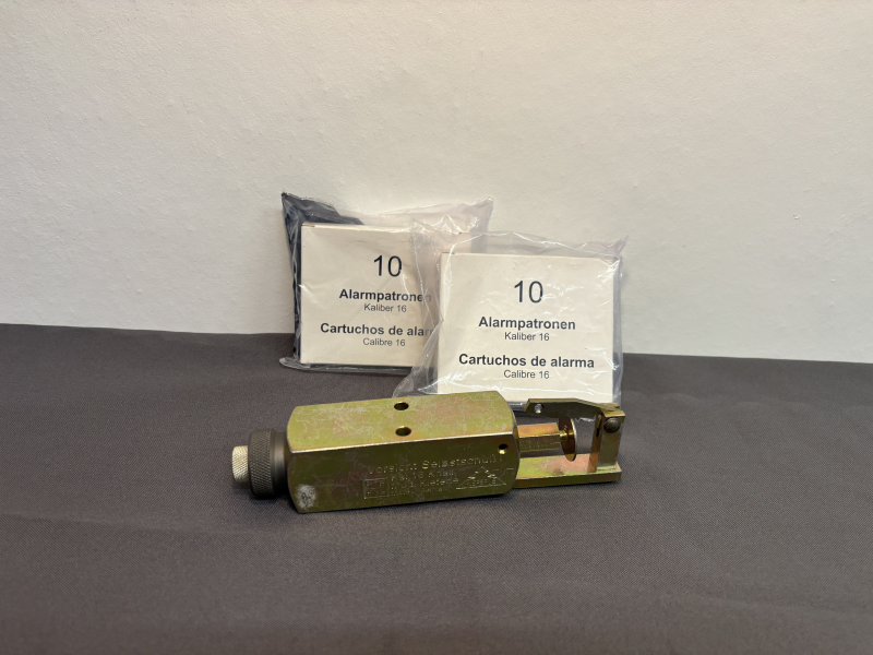 Ganz aus massivem, vollverzinktem Stahl hergestellt. Gewicht ca. 1 kg. Betrieb mit Alarmpatrone Kal. 16.