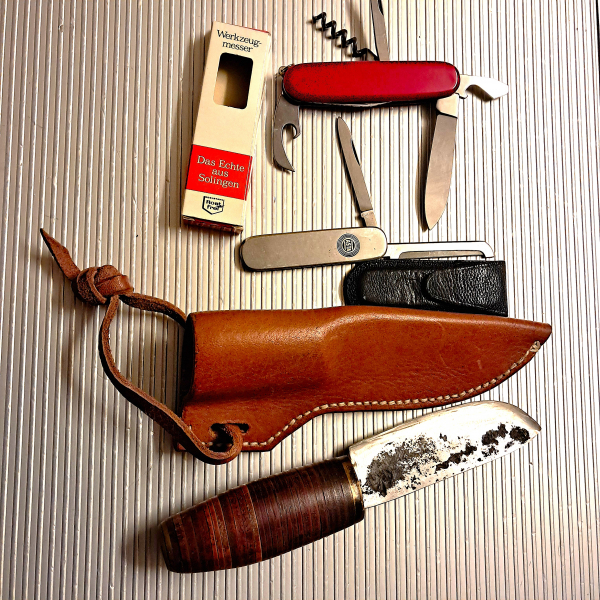 Verkaufe drei verschiedene Gebrauchsmesser, zwei mit Lederscheide, 1 in Pappschachtel.