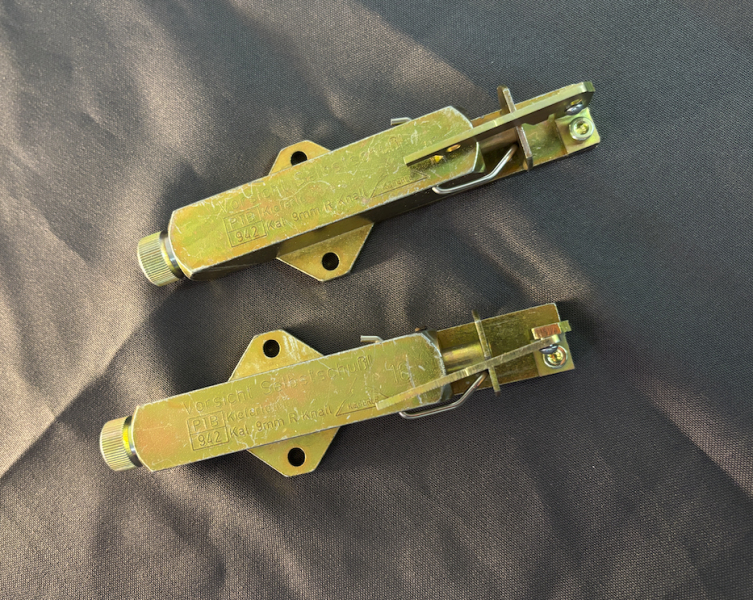 Mod. M1 Kal. 9 mm R Knall Das kleine kompakte Selbstschussgerät zur Gebäude- und Grundstücksicherung, zur Abwehr von Vögeln in Obst- und Weinbauanlagen und zur Wildschadenabwehr in Wald und Feld. Ganz aus massivem, vollverzinktem Stahl hergestellt. Größe 14 x 4 x 2 cm, Gewicht 370 g. Durch die verengte Mündung erzeugt die Knallpatrone einen sehr starken, kanonenschlagartigen Knall. Zur Gebäude- und Grundstücksicherung montiert man den Apparat flach und unauffällig auf ein Brett auf dem Boden. Stolperdrähte werden in ca. 10 cm Höhe gespannt. Zur Wildschadenabwehr werden Geräte an Pfählen um die zu schützenden Flächen montiert und Spanndrähte in entsprechender Höhe gespannt. Bei Schwarzwild ca. 50 cm, Rotwild ca. 1 m Höhe. Für 1 ha Fläche genügen je nach Gelände 3 – 5 Geräte. In Obst- und Weinbauanlagen wird das Gerät in der Anlage an einem Pfahl montiert und bei Bedarf von einer Person mit einer langen Schnur ausgelöst. (hier angeboten ist nur das Gerät, ohne Munition etc.) zugelassen und geprüft