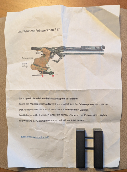 Gebrauchtes aber im Top Zustand befindliches Laufgewicht von Lottes. Für das Auflageschießen extraschweres Laufgewicht für die Luftpistole Feinwerkbau P8X.