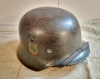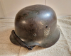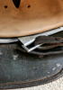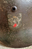 M35 Stahlhelm der XS Polizeidivision. Viel original Apfelgrüner Originallack, Stellenweise nachgedunkelt. Original Kinnriemen am Original Helmfutter-Aluring. Nur das Leder wurde ergänzt und ist reproduziert aber von sehr guter Qualität. Das Helmdach ist narbig.