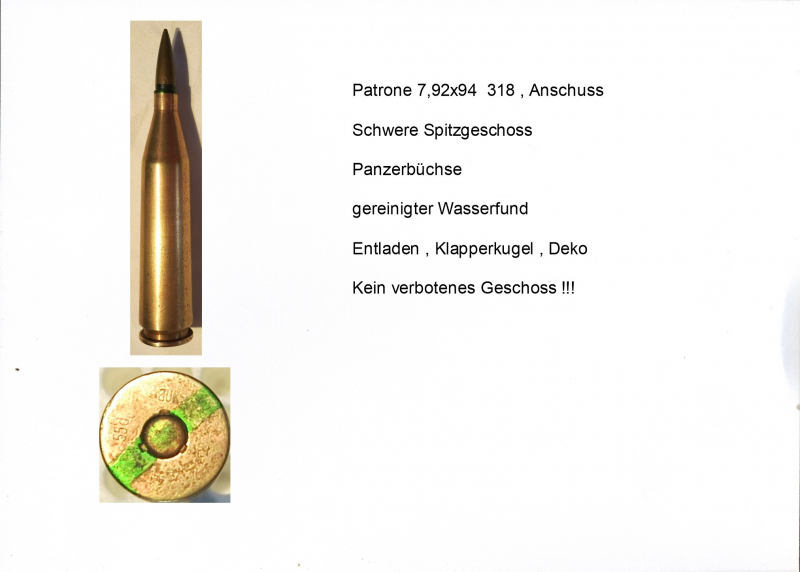 Aus Nachlass abzugeben. Patrone 7,92x94 318 Anschuss, Panzerbüchse,,, Privater Verkauf kein Umtausch oder Zurücknahme. Keine Garantie oder Gewährleistung. Versicherter Versand,,, Ohne Gefahrenstoffe Deko,, Entladen. Anschosspatronen wurden mit sS geschossen laboriert.,,, Beschreibung siehe Bild,,,, No Paypal