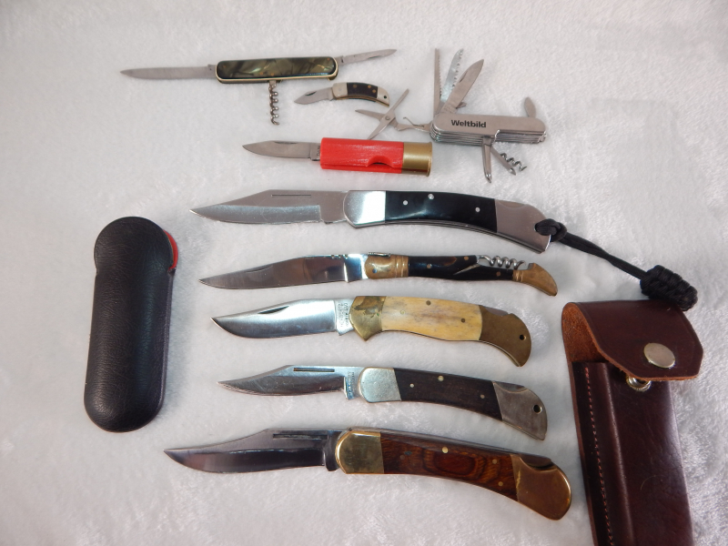 Sie bieten hier auf ein aus Sammlungsauflösung Messerkonvolut Taschenmesser 9 Stück verschiedene Hersteller mit und ohne Herstellerangaben Klingenlänge von ca.2,5 cm bis ca.10,0 cm Zustand siehe Bilder. Versandkosten beziehen sich auf den Versand innerhalb Deutschland Haftungsausschluss: Gemäß den Gesetzesbestimmungen für Privatverkäufe erfolgt die Auktion unter Ausschluss jeglicher Gewährleistung, Garantie und Rücknahme. Der Bieter erklärt sich damit einverstanden und erkennt dies mit seinem Gebot an. Der Artikel wird dem Höchstbietenden unter Ausschluss jeder Rechts und Sachmängel verkauft. Rückgabe des Artikels, Umtausch, Rücktritt, Minderung oder Nachverhandeln sind ausgeschlossen und werden nicht anerkannt. Laut dem neuen EU-Recht muss dieser Zusatz unter jeder Online-Auktion stehen. Bieten Sie nicht, wenn Sie damit nicht einverstanden sind.