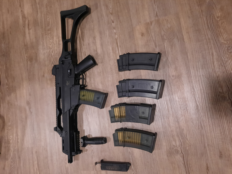 Hallo, Verkaufe hier mein Airsoft G36C vollauto. O,5 Joule also ab 14 Jahren erhältlich funktioniert gut und ist präzise. Ladegerät leider Nichtgebrauch vorhanden. Dafür 4 realcap Magazine 2 midcap und ein Highcap Magazin dabei. Die Magazine funktionieren ebenfalls, allerdings sind die Verbindungs Nippel teils abgebrochen um sie mit anderen Magazinen zu verbinden