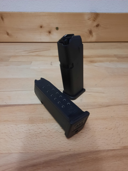 Zum Verkauf kommen die beiden selten genutzten und neuwertigen Magazine für die Pistole Glock 19. Die Magazinkapazität beträgt 15 Schuss. Es handelt sich um Originale.