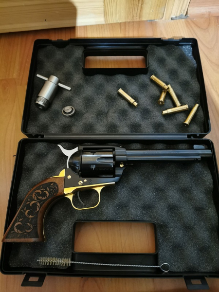 LEP ME Single Action Army SAA Revolver im Kaliber .22 (5,5 mm) Kombo INKLUSIVE Pumpe, Edelstahl LEP Full Adapter, 6 Patronen. Da ich gerade meinen WBK erhalten habe und mir einen Ruger Vaquero Kaliber .44 Stainless kaufen möchte, kann dieser wunderschöne Western Revolver weg.