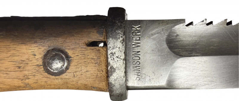 Zum Verkauf kommt ein Seitengewehr 14 mit Sägerücken und Feuerschutzblech, Drücker gängig, Scheide mit wohl nachträglich angebrachter Ortkugel und Brünierung, eine Delle auf der Vorderseite, Zustand siehe Fotos.