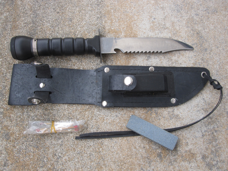 Sie bieten auf das abgebildete Messer mit dem abgebildetem Zubehör. (Schleifstein, Faden, Streichhölzer, Angelzeug usw). Gesamtlänge: 30 cm, Klingenlänge 14,5 cm. Alles Weitere entnehmen Sie bitte den Bildern. Die Bilder sind Teil der Beschreibung. Alle Angaben sind nach bestem Wissen und Gewissen gemacht, aber trotzdem das Unvermeidliche: Die Ware wird unter Ausschluss jeglicher Gewährleistung (Mängelansprüche) verkauft. Keine Rücknahme, Nachverhandlungen zwecklos. Bitte bieten Sie nicht, wenn Sie mit diesen Bedingungen nicht einverstanden sind.
