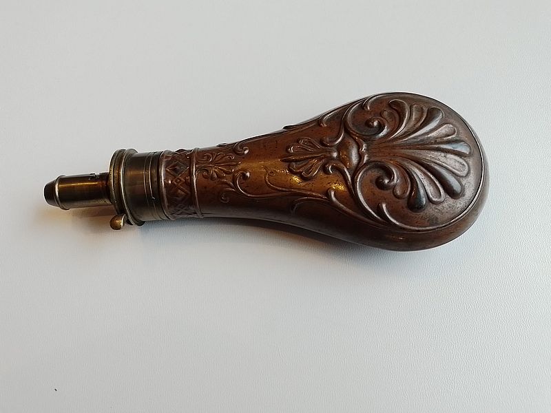 Pulverflasche. Vermutlich aus Kupfer und Messing.