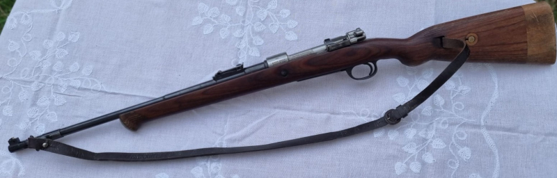 Aus gepflegtem Nachlass kommt dieser sehr praktisch modifizierte Mauser Argentino 1909 der DWM zum Verkauf. Der Schaft wurde fachmännisch angepasst, um sie als Durchgehwaffe zu nutzen. Die Gesamtlänge beträgt 110cm. Waffennummern auf Kammerstängel und Lauf sind identisch. Das Kaliber ist 7,65x53 Arg.