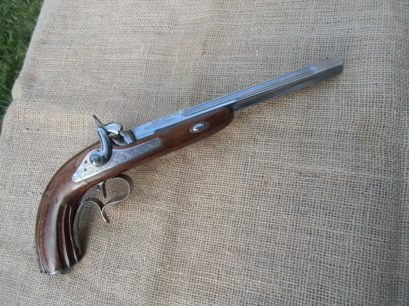 Schöne Gravuren am Lauf und Schloß; 12 Züge rechtsdrall, spiegelblang; höhenverstellbare Kimme; Korn verschiebbar im