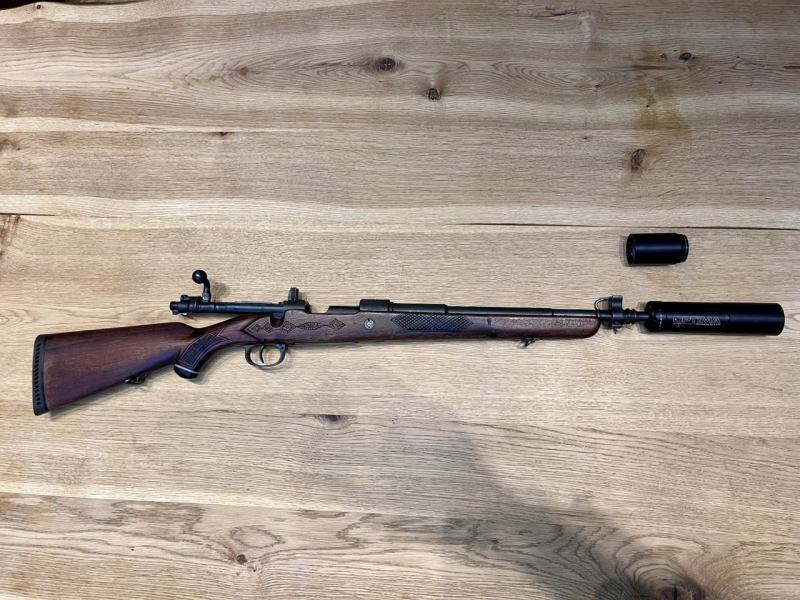 inklusive A-tec Optima 45 Schalldämpfer mit Quicklock Adapter. Es handelt sich um einen Overbarrel-Schalldämpfer, der die Gesamtlänge der Waffe sehr kompakt hält (ohne Mittelmodul: 105cm !!!).