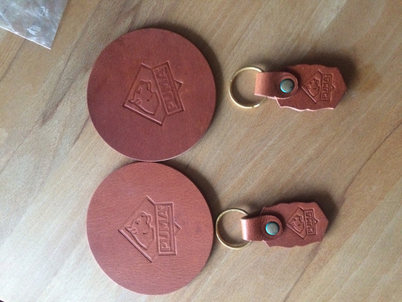 Hallo hier 2 Puma Bier-Deckel aus Leder 10 cm Durchmesser .... und 2 Schlüsselanhänger