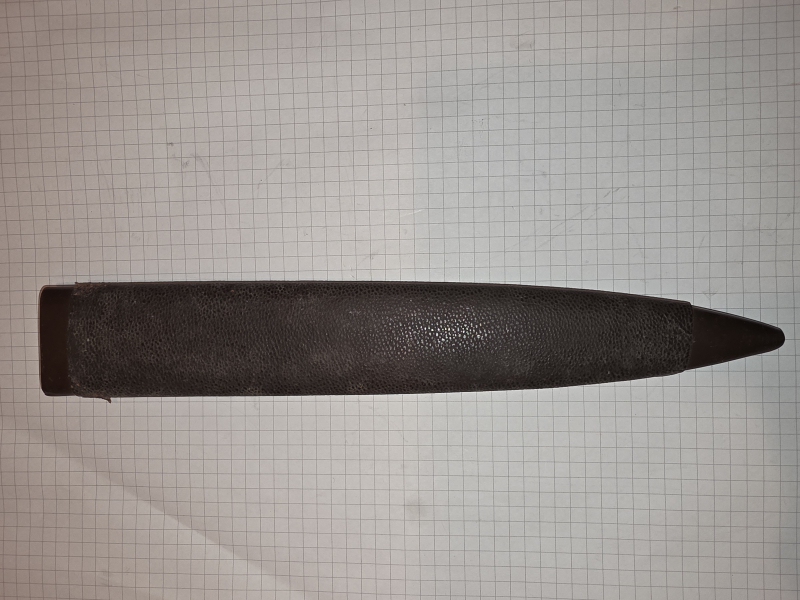 Zum Verkauf kommt eine Dolchscheide die mit Leder bezogen ist. Bitte seht selbst. Leider kann Ich dazu nichts weiter sagen. Da Ich privatverkäufer bin gebe ich keine Garantie oder Gewährleistung oder Rückgaberecht