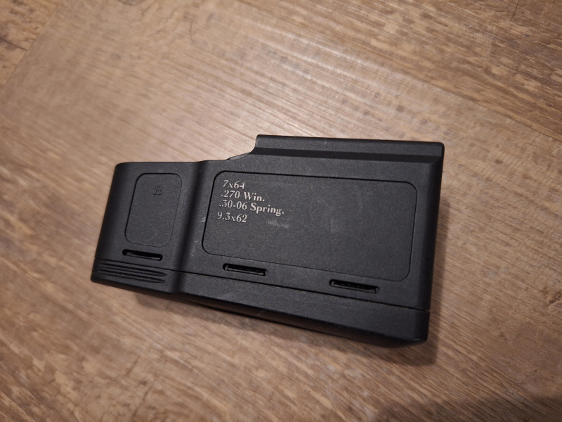 Sie bieten hier auf ein neuwertiges 5-Schuss Kunststoffmagazin für die Mauser M12 und M18 (passt wohl auch für Sauer 101). Passend für Mediumkaliber 30.06 / 7x64 / 9,3x62 / 270 Win. Wurde nicht benutzt, da ich eine andere Kalibergruppe brauche. Sehen Sie sich auch gerne meine anderen Auktionen mit weiteren, hochwertigen Zubehör- und Montageteilen an. Bei Fragen gerne melden und viel Spaß beim Bieten!