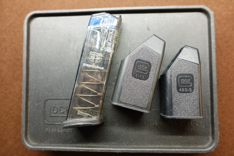 Glock Schachtel, 2 x Ladehilfe ( für normale und breite Magazine z.B. 9mm bzw. 45 ACP), 1 transparentes Magazin 17 Schüssig ( Aufschrift : ETS Group.US, Made in USA)