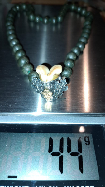 Diese handwerklich fein gearbeitete Jadekette in tiefem jagdgrün verbindet natürliche Materialien mit klassischem Brauchtum und wirkt sowohl stilvoll als auch kraftvoll.