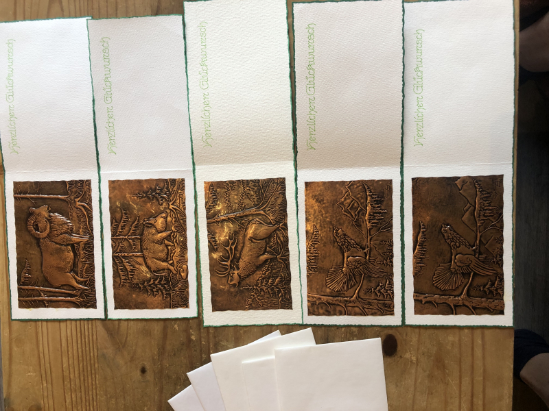 Verkaufe aus Jägerhaushalts-Auflösung 5 ganz besondere Glückwunschkarten die beim Abschuss überreicht worden. Das besondere ist das jeweils handgefertigte Kupferbild in der Karte. Die Karten werden inkl. Umschlägen geliefert!