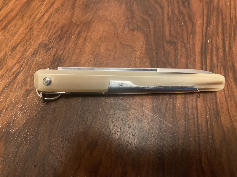 Hier versteigere /verkaufe ich ein Taschenmesser " FORGE MAIN " - J.M. Das Messer stammt aus einer Sammlung. Im geklappten Zustand ca. 15 cm, im offenen Zustand ca. 28 cm, Klinge einwandfrei ca. 12,5 cm. Die Griffe sind einwandfrei aus grünem Kunststoff. Die Klinke ist im ausgeklapptem Zustand fest eingerastet und lässt sich durch ziehen am Ring, wieder einklappen. Privatverkauf. Versand innerhalb Deutschland. Altersnachweis erforderlich.