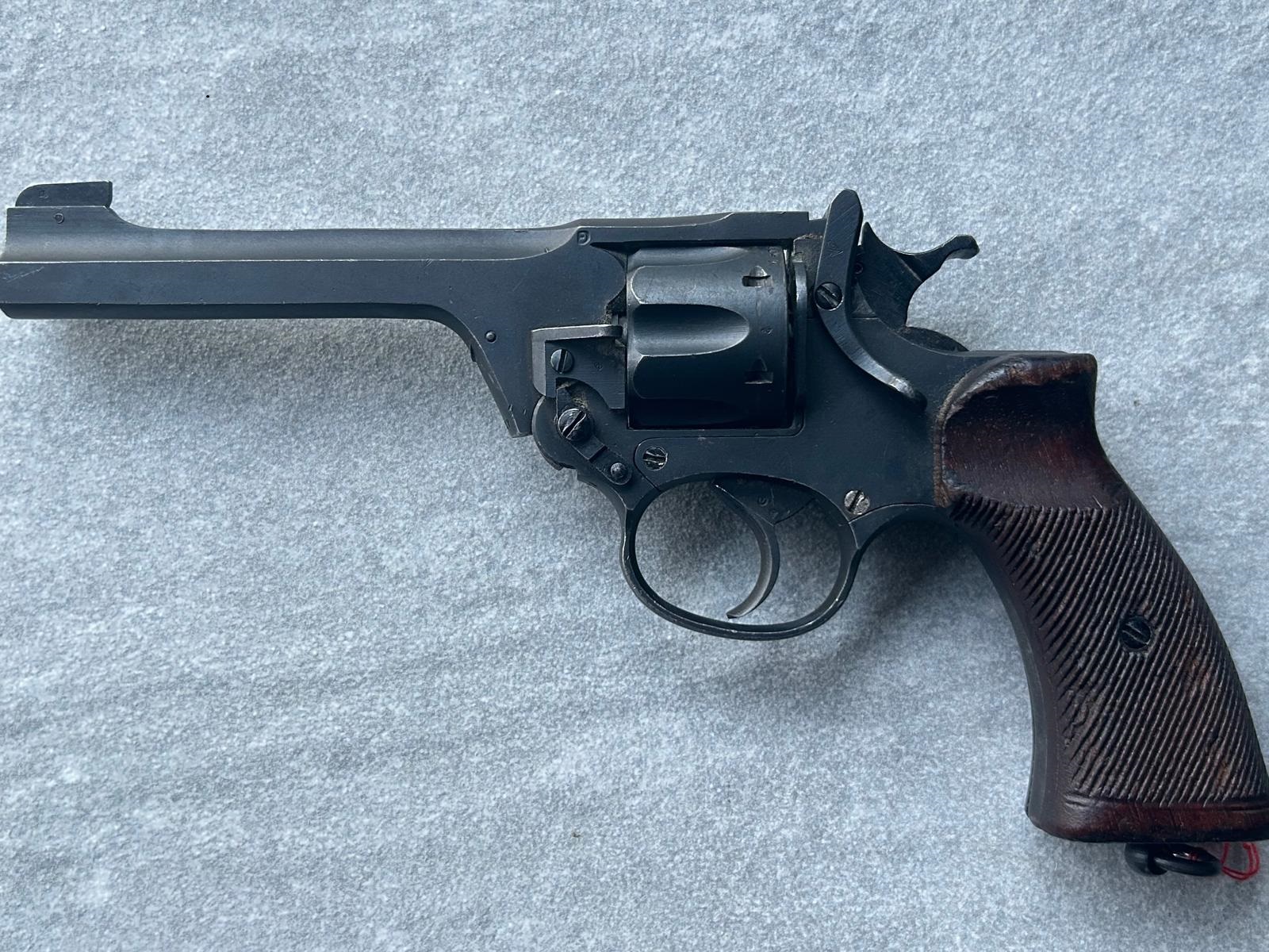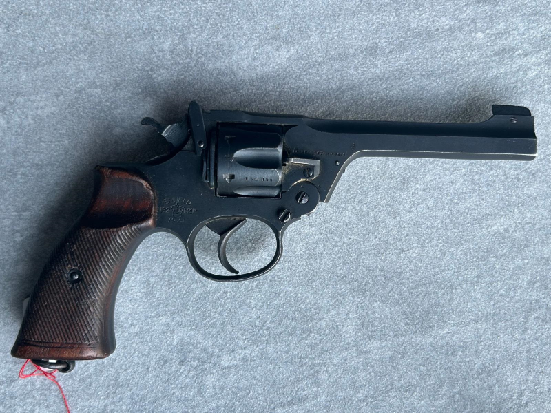 Enfield Revolver No2 MK 2*. Produktionsjahr 1941.Kaliber .38S&W. Mit britischen Abnahmestempeln. Offensichtlich wenig beschossene Arsenalwaffe. Top Zustand. Mit double-action Abzug. Die Holzgriffschalen sind geriffelt und ohne Risse. Lauf blank. Der Revolver ist Nummerngleich. Waffen stammt aus einer Sammlung, wird im Kundenauftrag verkauft. Differenzbesteuerung. Alle Angaben nach bestem Wissen und Gewissen. "Beantworte keine E-Mails". Den beschriebenen Zustand entnehmen Sie bitte aus den Bildern. Internationaler Versand ist nur möglich, wenn Sie mir Ihren deutschen Waffenhändler nennen, der den Waffenexport für Sie übernimmt.