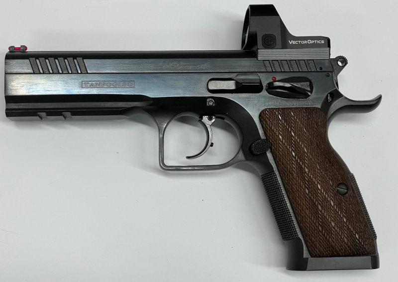 Tanfoglio Stock III mit tief eingesetztem Red Dot, ideal für IPSC Production Optic und andere Optic Disziplinen. Das Kaliber ist 9mm Luger (9mm x 19) Montiert ist ein Vector Optics Frenzy X 1x22x26. Das RedDot ist neu, die Waffe wurde jetzt erst auf Optic umgeändert. Das Frenzy ist ein erprobtes Glas für Schlittenmontage und hat einen feinen klaren 3MOA roten Punkt. Montiert ist es auf einer Adapterplatte aus Werkzeugstahl. Die Tanfoglio wurde von mir als Ausstellungswaffe genutzt und hat nicht mehr als eine Gesamtschusszahl von 1.000 Schuss absolviert, ausschließlich Fabrikmunition. Die Waffe kann nach Absprache bei mir besichtigt werden. Für internationalen Versand bitte die Versandkosten anfragen.