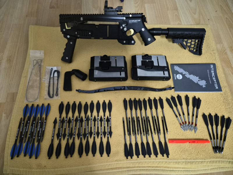 Bestehend aus: - Armbrust Mai Interceptor cal. 6,3 Zoll, -2- Magazine mit jeweils18 Schuss, -1- Trockenschusssicherung, -1- Red/Greendot von EK, -1- zusätzliche Schafterhöhung, Serienwurfarm nit 60 Lbs, Zusatzwurfarm mit 120 Lbs (ohne Endkappen mit Sehne und Spannseil, -55- Pfeile/Bolzen von Gogun/Steambow:
