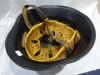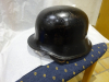 Stahlhelm Modell Reichswehr schwarz eingefärbt für Feuerwehr , mit kompletter Innenausstattung , sternförmige Lüftungslöcher, verwendet im III.Reich um 1935,rautenförmige Abnahmeprägung hinten mittig innen