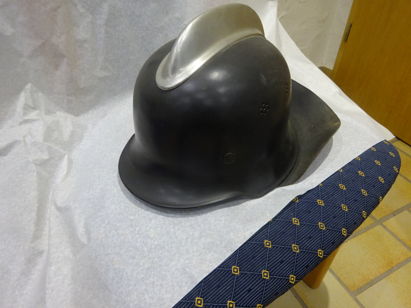 Stahlblechhelm schwarz mit silbernem Kamm, mit Innenausstattung von 1930 verwendet im Saarland bis 1954 zu feierlichen Anlässen, Feuerwehr pp. guter Zustand, siehe Fotos und mein egun