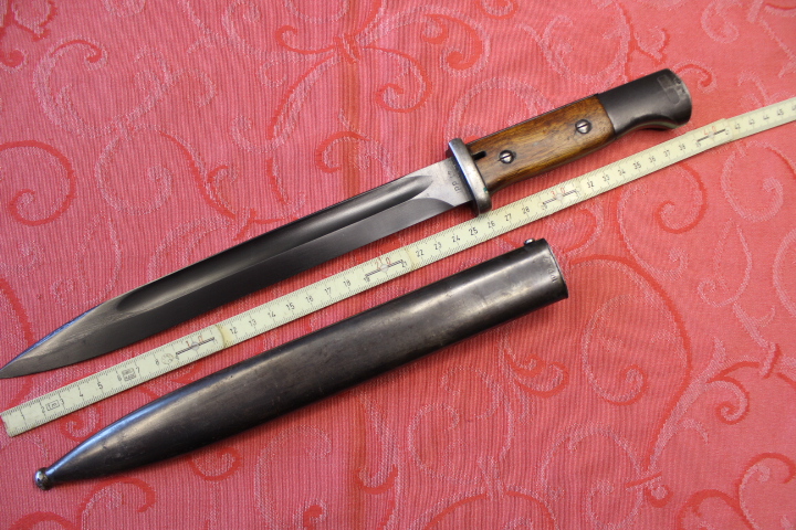 Im Fundzustand. Nicht für die Auktion irgendwie geschönt. Noch nicht Gereinigt. Der Drücker ist Leichtgängig . Komplett Original. Die Scheide und das Bajonett haben den selben Hersteller und Seriennummer. Zustand siehe die Bilder. Porto EU= 19,50€