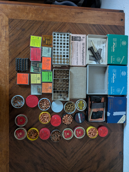 Verkaufe dieses Bunte Konvolut. Hat sich alles so aus Haushaltsauflösungen angesammelt. Magazine, Munition etc. Die Stangenmagazine sollten für Röhm RG 3 sein.