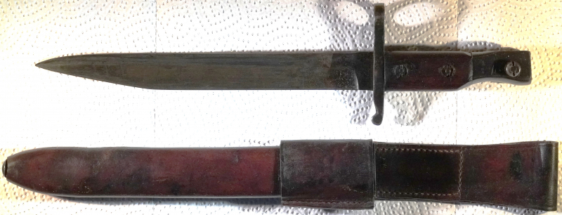 Original kanadisches Ross Bajonett aus dem 1. Weltkrieg (im 2. Weltkrieg weiterverwendet) mit der originalen Lederscheide (ohne Risse). Auf dem Bajonett befinden sich der kanadische Eigentumsstempel, der Herstellmonat 3 (oder 8?)/16 (=1916) sowie div. Abnahmestempel. Als Beutewaffe bei der deutschen Wehrmacht als Seitengewehr 128 (c) bezeichnet.