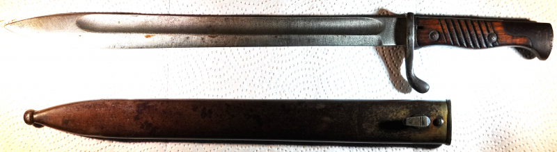 Original deutsches Seitengewehr 98/05 von 1916. Von den Gegnern im 1. Weltkrieg als "Butcher Knife" (Fleischermesser) bezeichnet. Herstellerstempel: "Pack Ohliger & Co Solingen" deutlich zu erkennen. So wie insgesamt der Zustand des Stückes recht schön ist im Vergleich zu den meisten anderen auf dem Markt. Abnahmestempel auf der Klinge und dem Gefäss vorhanden. Holzgriffschalen in gutem Zustand. Diese Bajonette wurden später in der Reichswehr weiterverwendet und danach oft an die "Elite" abgegeben, die ja bis zu Beginn / Mitte des 2.Weltkrieges keine neuen Wehrmachtswaffen bekamen.