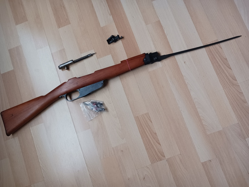 biete hier die komplette Schäftung + alle freien Ersatzteile (außer der Auszieherkralle) eines italienischen Carcano Karabiners aus dem 2ten Weltkrieg an.